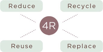 サステナブルな活動として取り組んでいるのが、Reduce、Reuse、Recycle、Replaceの「4R活動」。空き容器の回収や素材の再利用、プラスチック・紙の削減などを積極的に行い、豊かな地球環境の実現を目指しています。