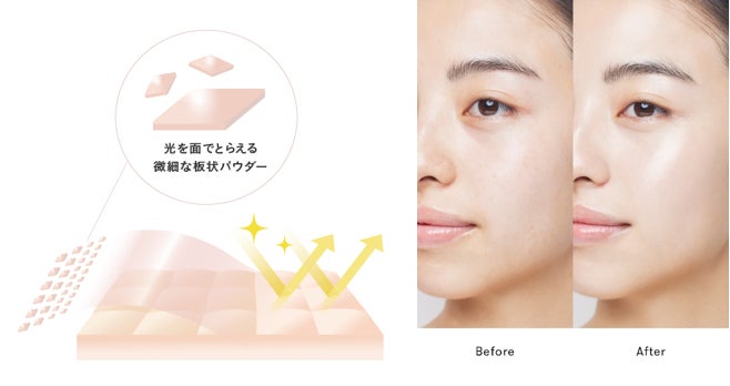 不純物がなく、時間がたって汗や皮脂に触れてもくすみにくいクリアフィットパウダーが肌の透明感を長時間キープ。さらに、肌温度に触れると雪のように溶け込むスノーメルティングパウダーが肌温度に触れると透明に変化し、艶だけを残す。天然の肌艶のような美しい光反射を叶えます。