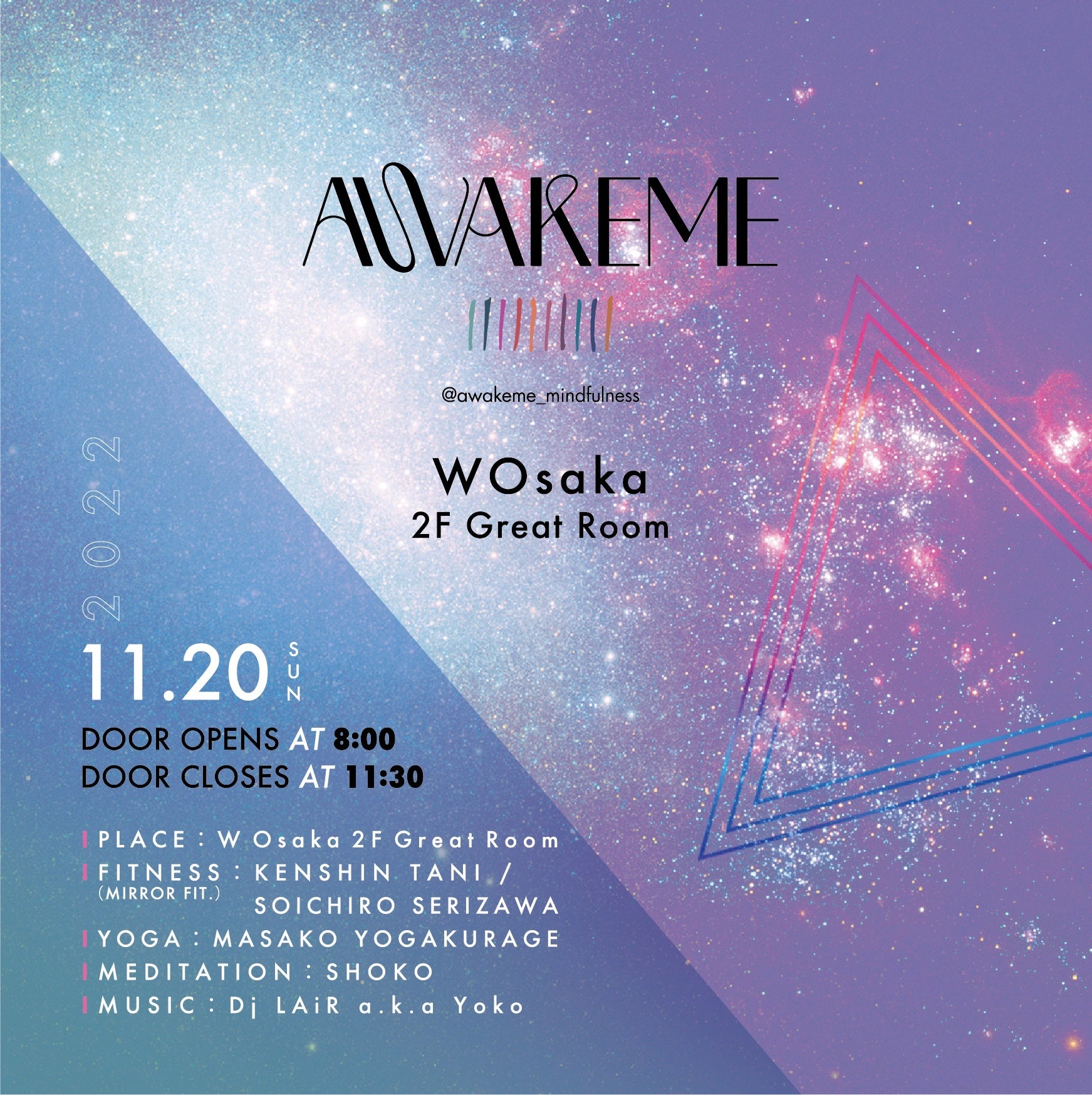 フィットネスのパートを担当していただくのは、MIRROR FIT.のインストラクター谷顕真さんと芹沢宗一郎さん。ヨガは今注目のセロトニンヨガ公式講師も務めるよがくらげ雅子さん。瞑想は「自分を大切にする」ことをマインドフルネスを通して伝えているSHOKOさん。最後はDJ LAiR a.k.a YokoさんのDJプレイと「W 大阪」のバーテンダー自慢のモクテルでモーニング・ウェルネス・パーティを締めくくります!