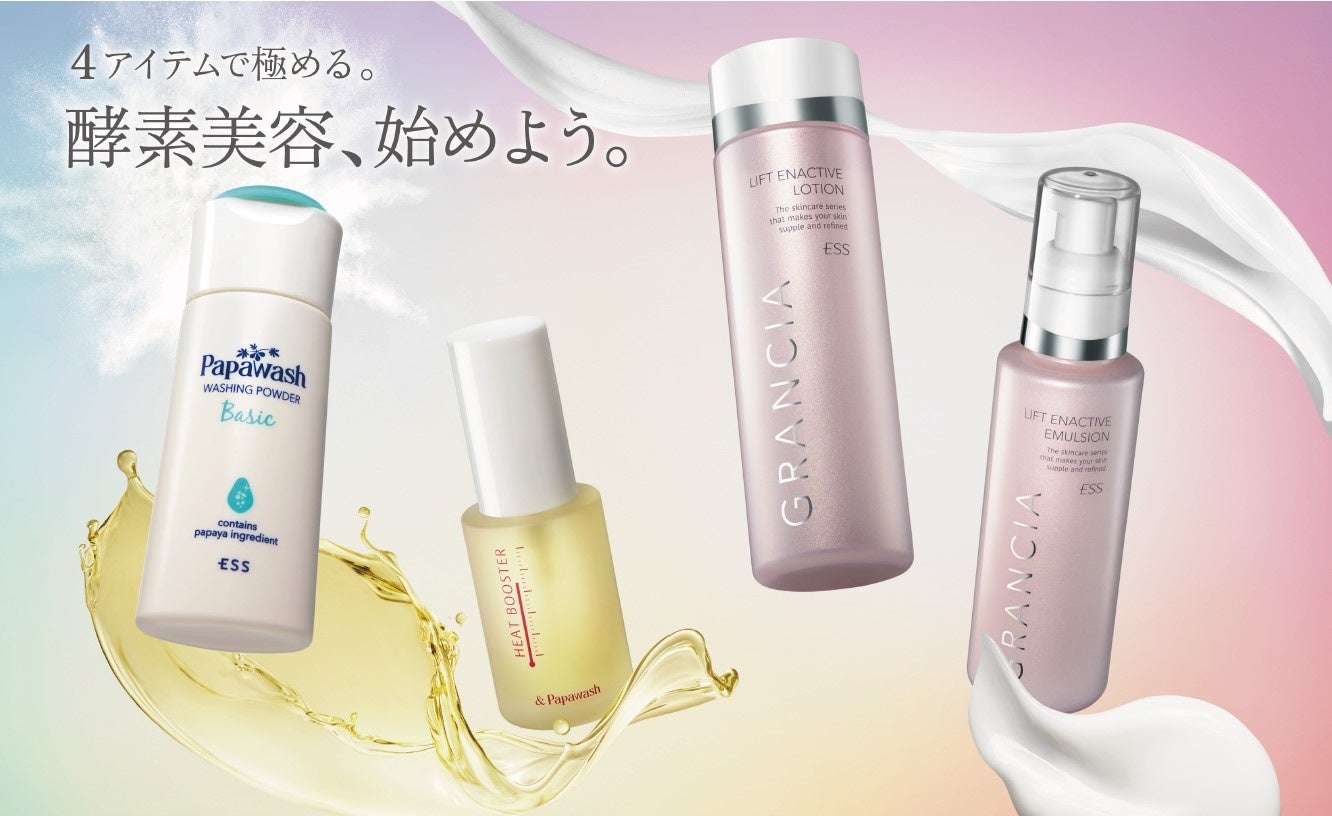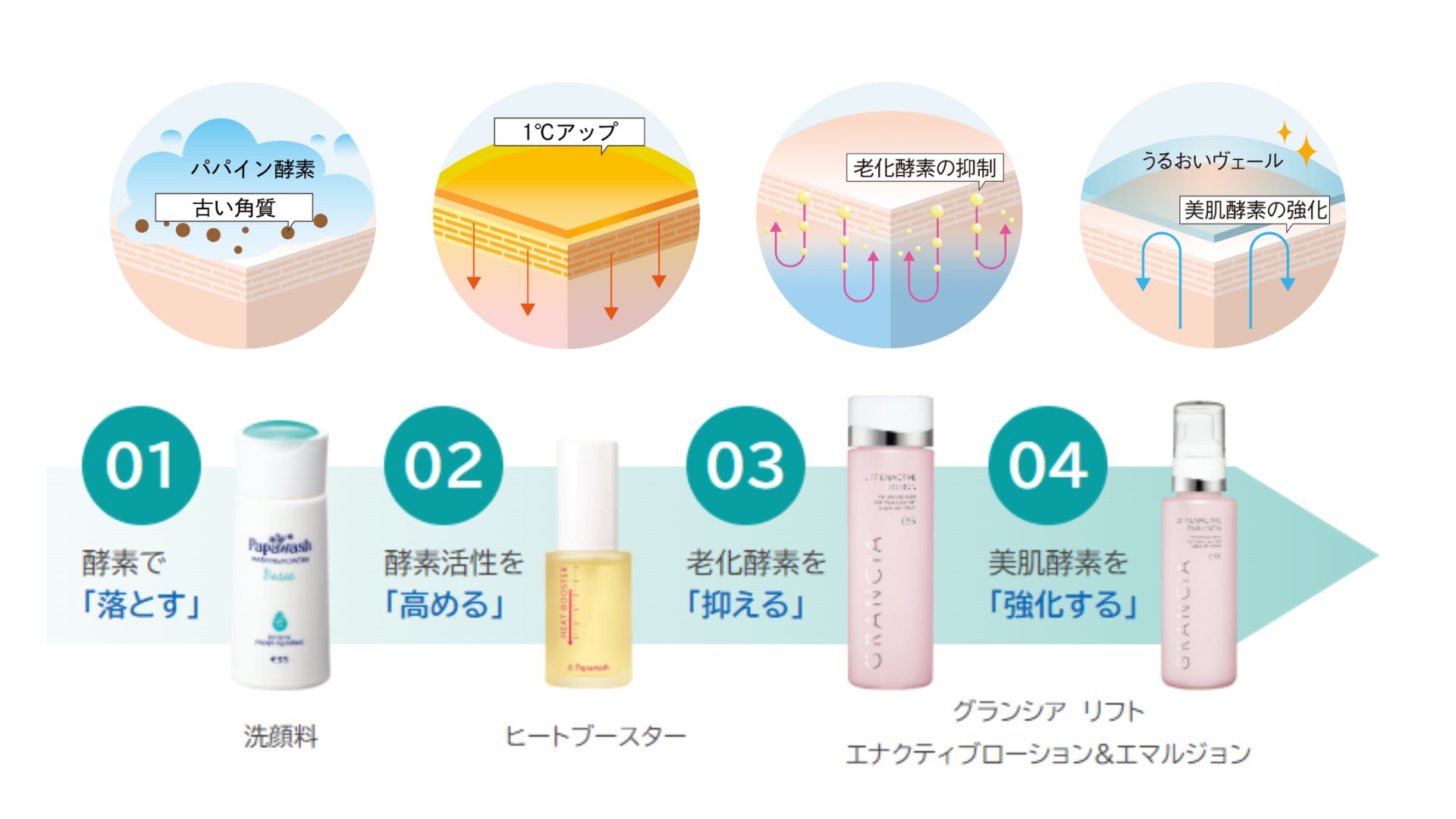 オリジナルパパイン酵素洗顔料“パパウォッシュ”による「落とす」ステップに加え、温活導入美容液“ESS ヒートブースター”で酵素活性を「高める」、2022年9月に誕生した新・基礎化粧品“グランシアリフト エナクティブローション”で老化酵素を「抑える」、同“エマルジョン“で美肌酵素を「強化する」ケアが完成。