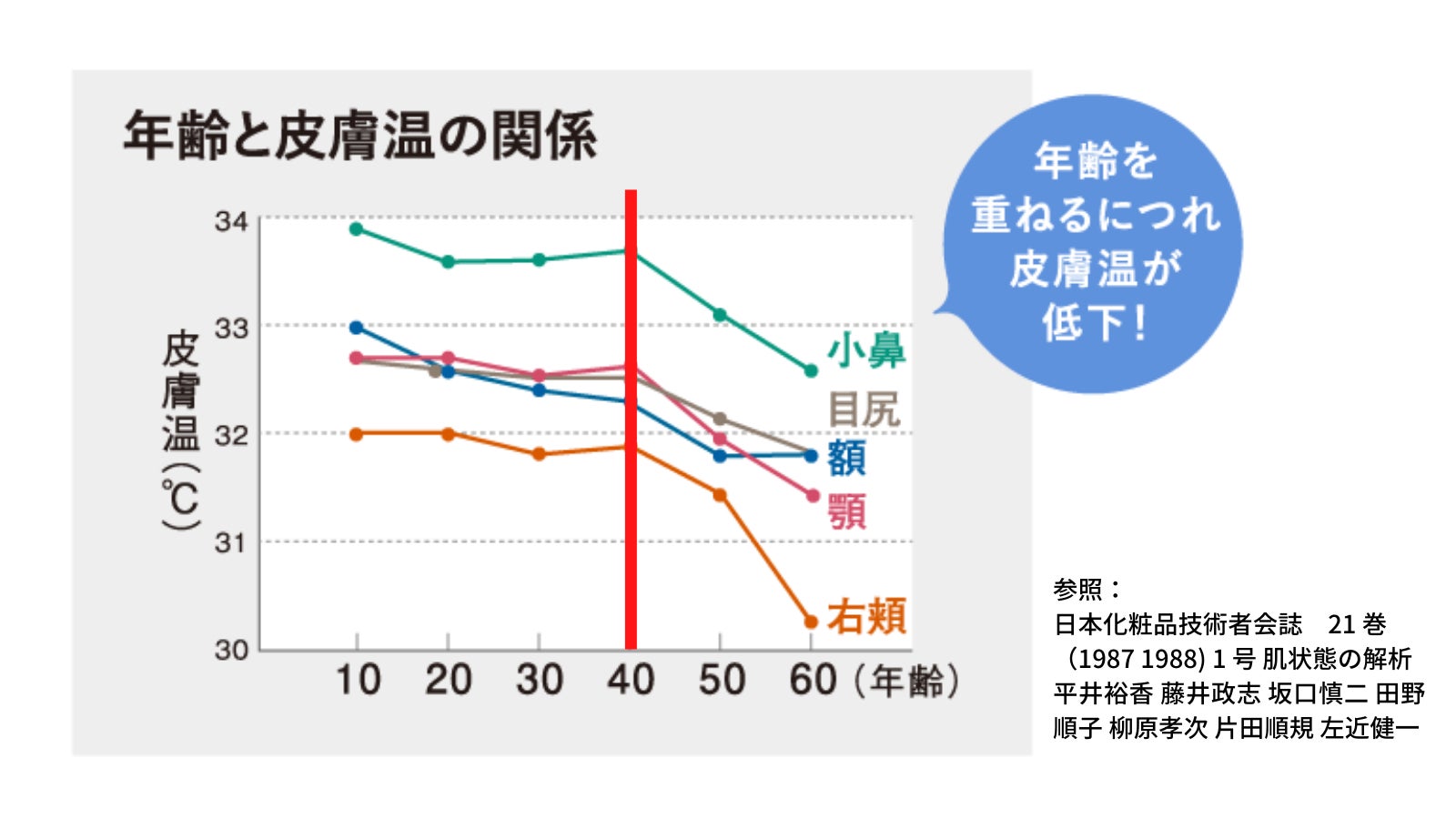 ほとんどの酵素の至適温度は37℃前後ですが、40歳を境に皮膚温が下がるため、肌内の酵素活性が鈍り、肌老化を後押しすることが考えられます。