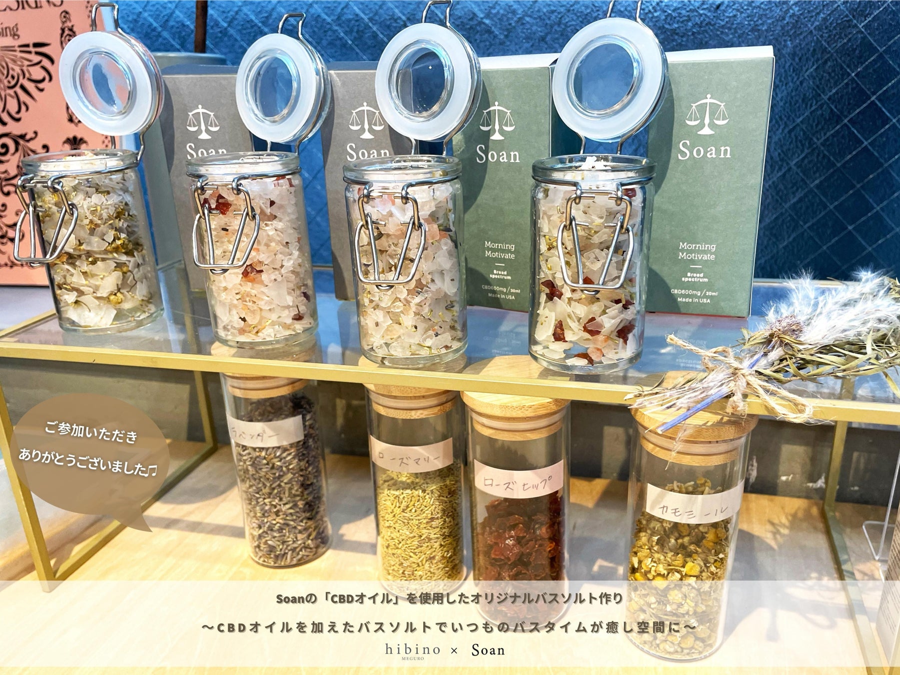 こだわりぬいた原材料でつくられたCBD製品を販売する株式会社SOAN(本社:東京都世田谷区玉川3-20-2、代表取締役:高橋政樹)は、Soan People CBDオイルRecoveryを使用したバスソルト作りのワークショップを hibino MEGUROにて開催。