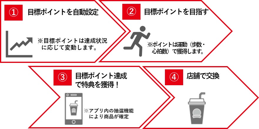 - アクティブチャレンジでは、1週間ごとに設定される目標ポイントを達成することで、特典(ドリンクチケット等)を必ず獲得でき、楽しみながら運動習慣を身につけることで、健康増進につなげることを企図しています。