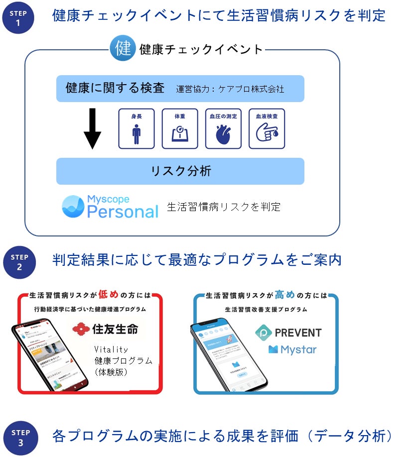 そこで、住友生命が提供する健康増進型保険“住友生命「Vitality」”の健康プログラムと、PREVENTが提供する医療データ解析「Myscope Personal」および生活習慣改善支援プログラム「Mystar」を活用し、特定健康診査の受診率向上、生活習慣病の発病や重症化の予防、健康増進活動によるQOLの維持・向上を目指します。