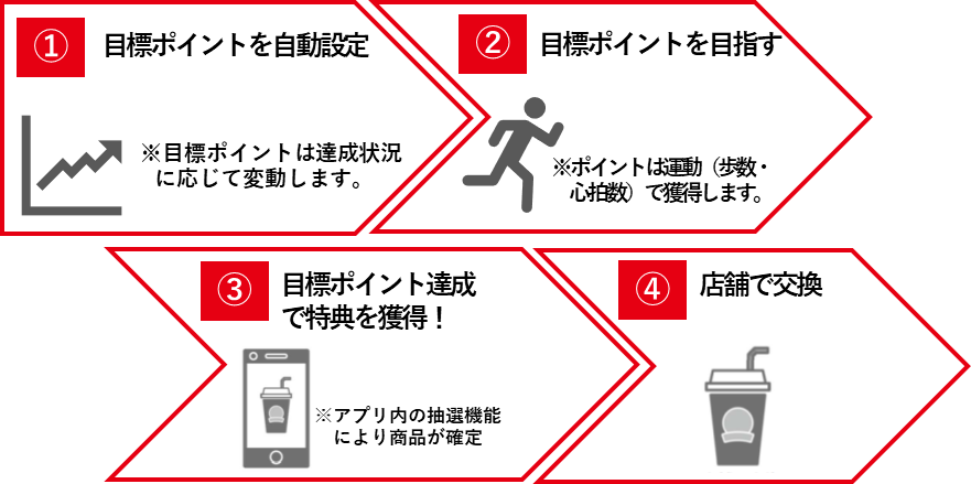 - アクティブチャレンジでは、1週間ごとに設定される目標ポイントを達成することで、特典(ドリンクチケット等)を必ず獲得でき、楽しみながら運動習慣を身につけることで、健康増進につなげることを企図しています。