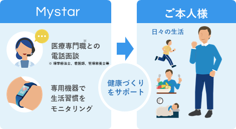 生活習慣の改善が必要な方には、生活習慣改善支援プログラム「Mystar」を通じて生活習慣の記録や専門資格※6を持つ面談担当者からのサポートを受けていただくことにより、生活習慣病のリスク低減を図ります。