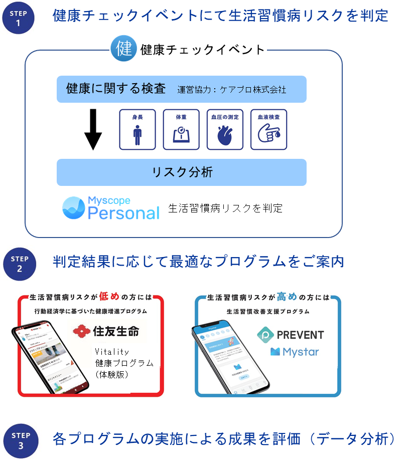 そこで、住友生命が提供する健康増進型保険“住友生命「Vitality」”の健康プログラムと、PREVENTが提供する医療データ解析「Myscope Personal」および生活習慣改善支援プログラム「Mystar」を活用し、特定健康診査の受診率向上、生活習慣病の発病や重症化の予防、健康増進活動によるQOLの維持・向上を目指します。