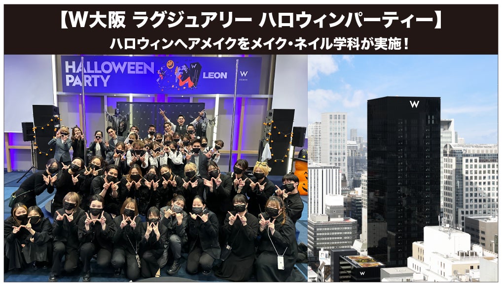 大阪モード学園メイク・ネイル学科は、2022年10月21日(金)ラグジュアリー・ライフスタイルホテルW大阪で開催された「W大阪 ラグジュアリーハロウィンパーティー」にて、遊び心溢れる大人のハロウィンパーティーに来場されたゲストをもてなすスタッフの方々を、ハロウィン・ヘアメイクで変身させイベントを盛り上げました。
