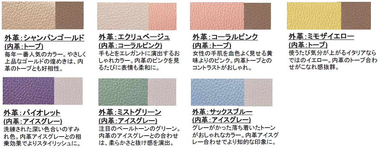 世界的なファッショントレンドを生み出すイタリアの目にするだけで心が躍る最新カラーラインナップから、やわらかな色合いで女性の手肌まで美しく彩る7色を厳選。外革と内革が異なるおしゃれなバイカラーのデザインで、手にするたびに気分が華やぎます。