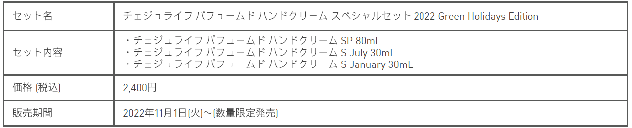今年はイニスフリーを代表するスキンケアを詰め合わせた2つのスペシャルセットと、3種類のホリデー限定パッケージアイテムをご用意しました。スペシャルセット1つ目は「グリーンティーシード セラム N スペシャルセット」。大人気の導入美容液「グリーンティーシード セラム N」がホリデー限定のビッグサイズとなり、今年8月にリニューアルした「グリーンティー ライン」の化粧水とクリーム、洗顔料がお試しサイズで付いてくるお得なセット。2つ目はホリデー限定の香りを含む3種のハンドクリームをセットにした「チェジュライフ パフュームド ハンドクリーム スペシャルセット」。乾燥が気になるこの季節に、ほっこりと幸せを感じていただけるスペシャルセットです。ホリデー限定パッケージアイテムは、発酵茶葉由来のベストセラー美容液「ブラックティー ユース セラム」、もっちり肌へと導く「グリーンティーシード モイスト クリーム」、ビューティーアワードを2冠獲得*1で話題の「レチノール シカ リペア セラム」の3種を発売します。