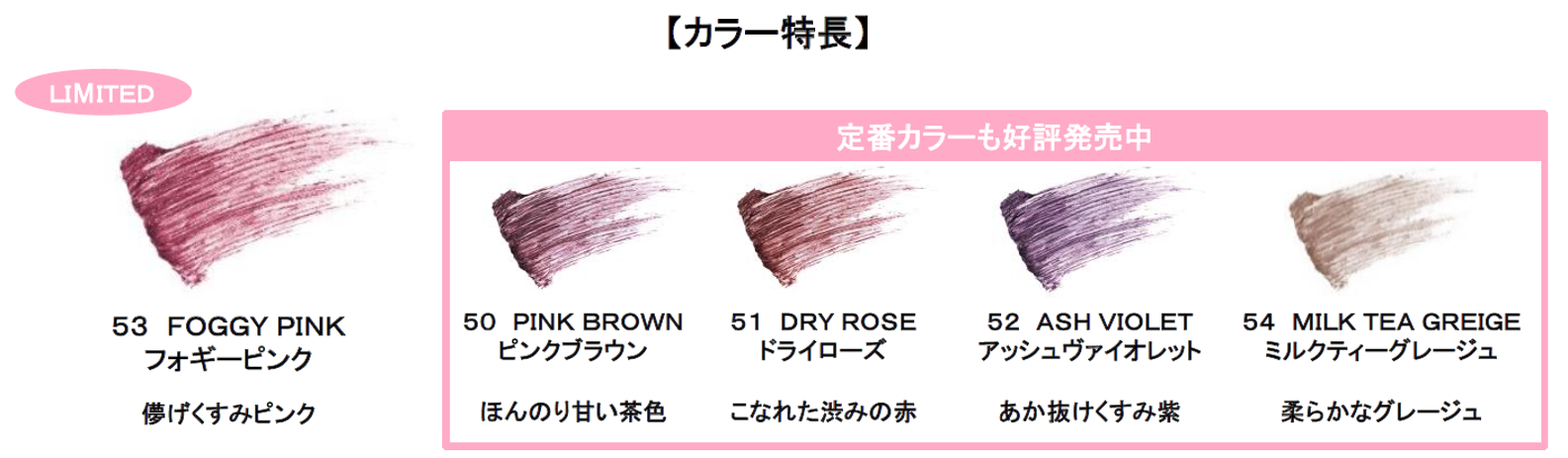 トレンド感あふれるくすみピンクが、透明感ある優しい目もとを演出し、瞳に甘さをプラスします。