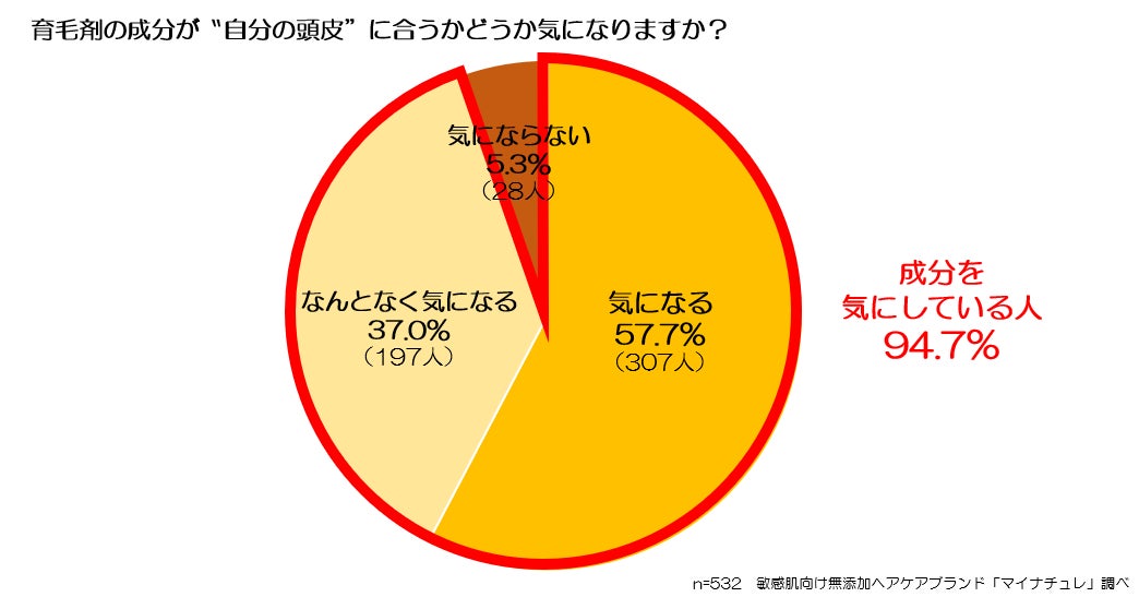 「気になる」は約6割、「なんとなく気になる」は約4割で、「気にならない」人はわずか5.3%という結果になり、全体の94.7%とほぼ全員が、自分の頭皮に合うかどうか成分を気にしていることが判りました。