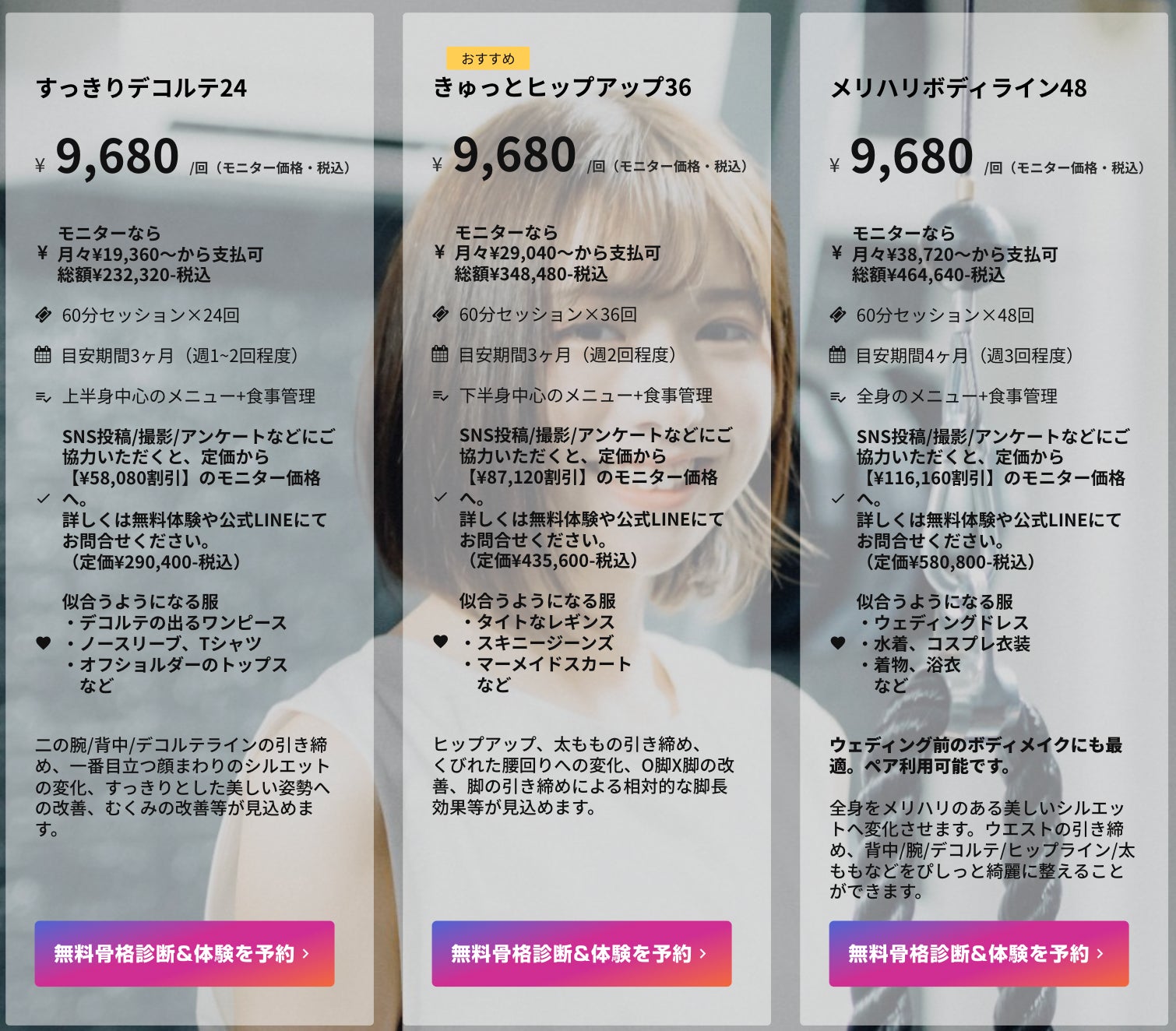 それぞれのプランで、定価より割引してお得にボディメイクを行っていただけるモニターを若干名募集しております。※モニターは定員が埋まり次第募集を終了します。