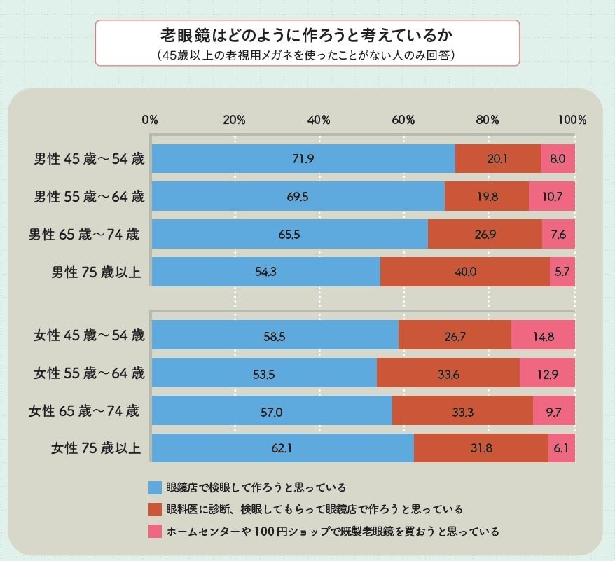老眼鏡を作るとき、どの世代でも検眼して作ろうと思っている人が8割を超えていることが分かります。