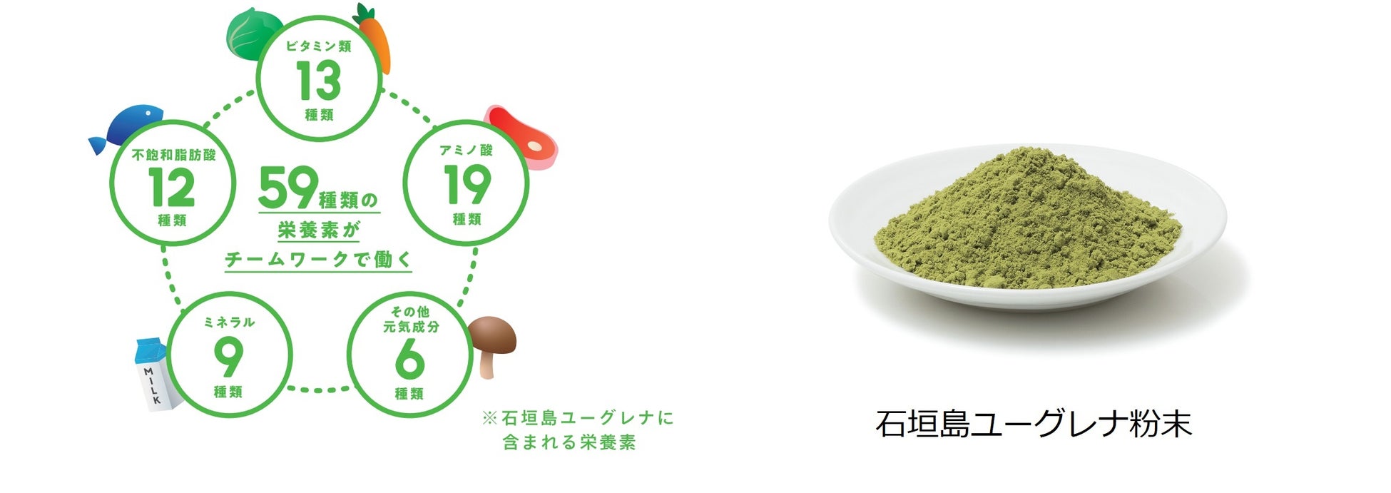 「石垣島ユーグレナ」は、動物性と植物性食品に含まれる栄養素をバランス良く持っています。「石垣島ユーグレナ」を摂取することで、毎日のカラダづくりに欠かせない豊富な栄養素を体内に届け、すみずみまで栄養を巡らせ、健康の土台を整えることで、まもるチカラを支え、カラダの根本からアプローチします。