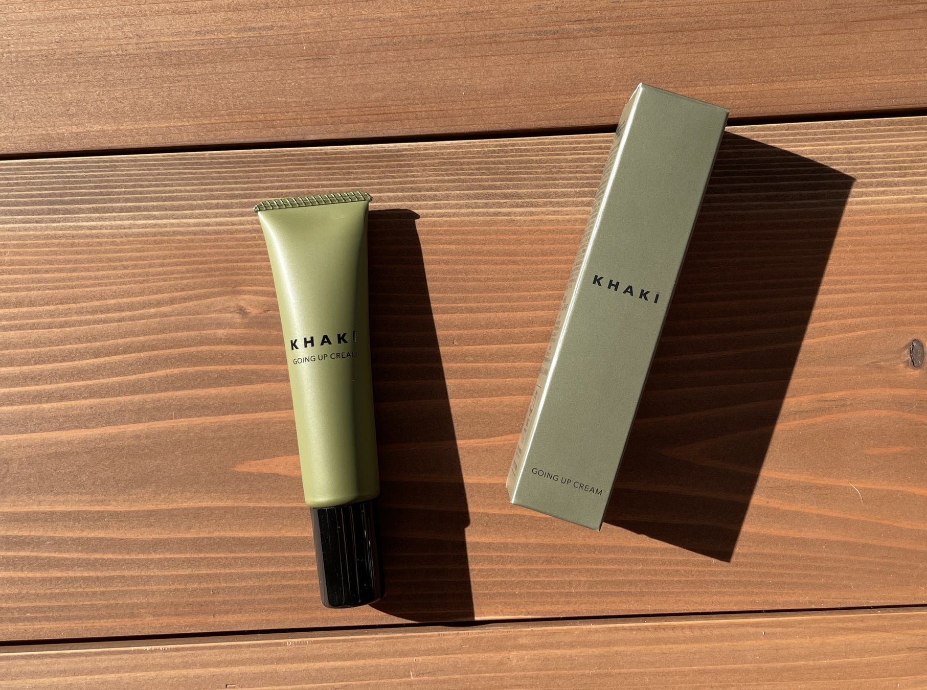 KHAKI GOING UP CREAMは小さくて軽いので持ち運びしやすく、外出先で顔が疲れていると感じた時にさっと取り出してひと塗りするのにも抵抗ない、落ち着いたデザインです。