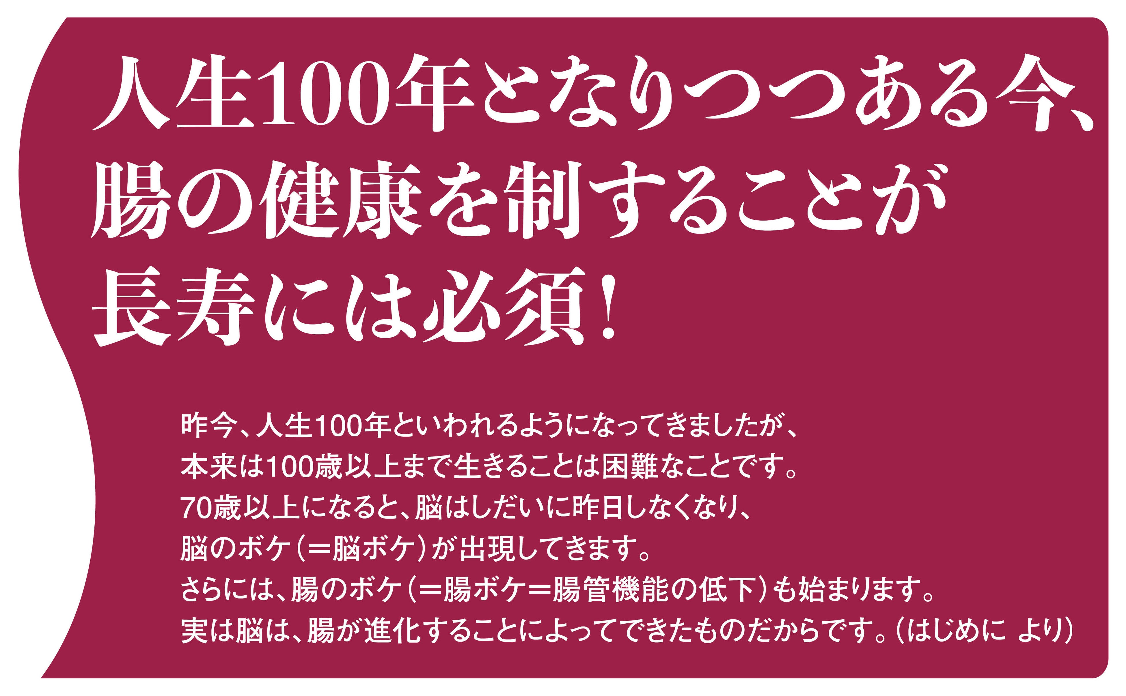 昨今、人生100年といわれるようになってきましたが、本来は100歳以上まで生きることは困難なことです。70歳以上になると、脳がしだいに機能しなくなり、脳のボケ(=脳ボケ)が出現してきます。さらには、脳だけでなく腸のボケ(腸ボケ=腸管機能の低下)も始まります。