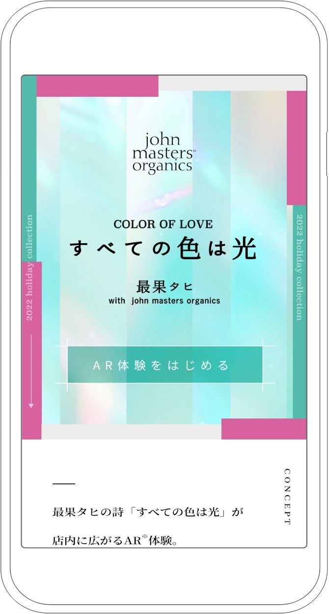 ジョンマスターオーガニックは2022 holiday collection発売と同時に、最果タヒの詩と製品を一緒に楽しめるAR体験を直営店で開始します。店頭でしか読むことのできない書下ろしの詩とオーガニックコスメがAR技術により融合し、心躍るホリデーの世界を演出します。さらに、ARをご体験いただいたお客様には、限定の壁紙やお得なクーポンもご用意しています。