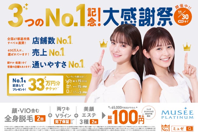 全国に168店舗(※3)を運営する美容脱毛サロン『ミュゼプラチナム』は、株式会社東京商工リサーチの調査において、11年連続「売上No.1(※1)」、「店舗数No.1(※1)」を獲得したほか、今回新たに「通いやすさNo.1(※2)」を獲得いたしました。この3つのNo.1獲得を記念して、「ミュゼはじめての方に向けた大感謝祭キャンペーン」を11月1日(火)より開催いたします。