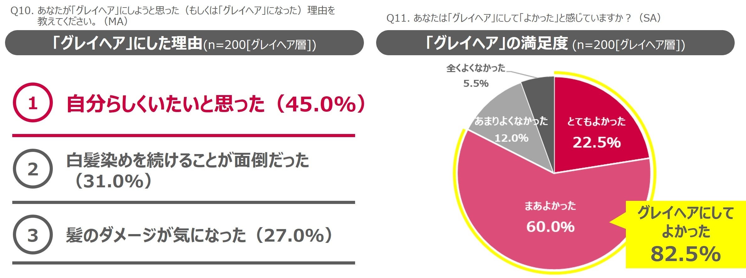 次に、「グレイヘア層」の50~70代の女性に「グレイヘアにしようと思った理由」について調査。結果、「自分らしくいたいと思った(45.0%)という回答が最も多く、次いで「白髪を染め続いてるのが面倒だった(31.0%)」、「髪のダメージが気になった(27.0%)」と続く結果となりました(Q10)。また「グレイヘアにした満足度」を聞いてみると、約82.5%が「グレイヘアにしてよかった(とてもよかった+まあよかった)」と回答し、8割以上の人がグレイヘアに満足していることが明らかとなりました(Q11)。また、その理由としては「自分らしくいられるようになった(58.2%)」が最も多く、グレイヘアで“自分らしさ”を楽しんでいる人が多いことが分かりました。