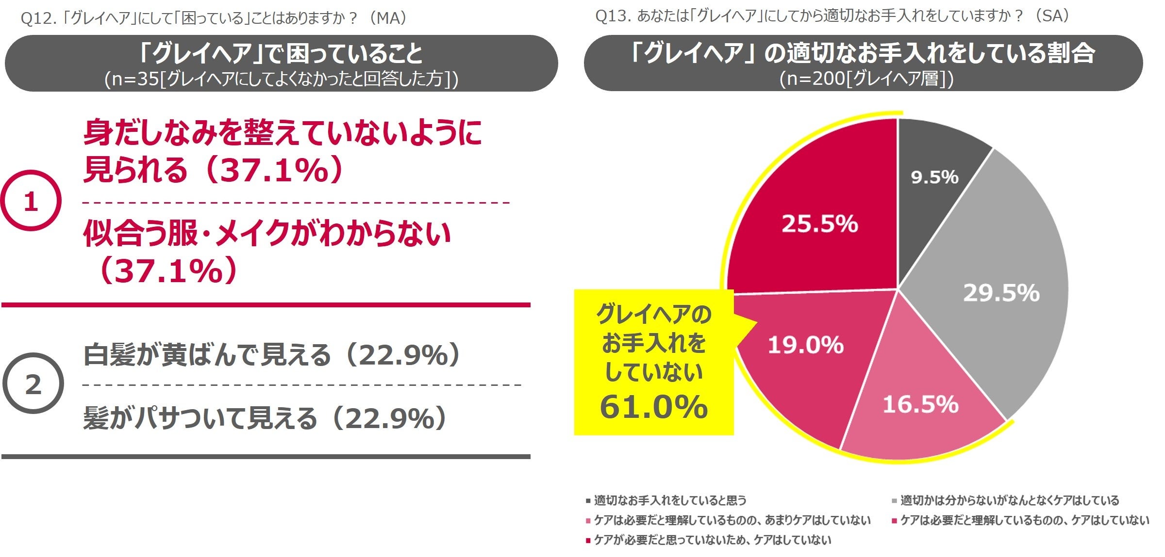 一方、「グレイヘアにして困っていること」については、「身だしなみを整えてなく見える(37.1%)」「似合う服・メイクが分からない(37.1%)」が同率で1位。次いで「白髪が黄ばんで見える(22.9%)」「髪がパサついて見える(22.9%)」がランクインする結果に(Q12)。しかし「グレイヘアのケア」に関しては、6割以上が「ケアをしていない」と回答し、適切なお手入れを行っている人が半数以下であることが明らかになりました(Q13)。認知としても、約3割の人が「ケアしなくてもグレイヘアだと思う」と回答していたように、白髪の黄ばみやパサつきの悩みを感じながらも、グレイヘアにケアが必要なことを知らない人が多いようです。