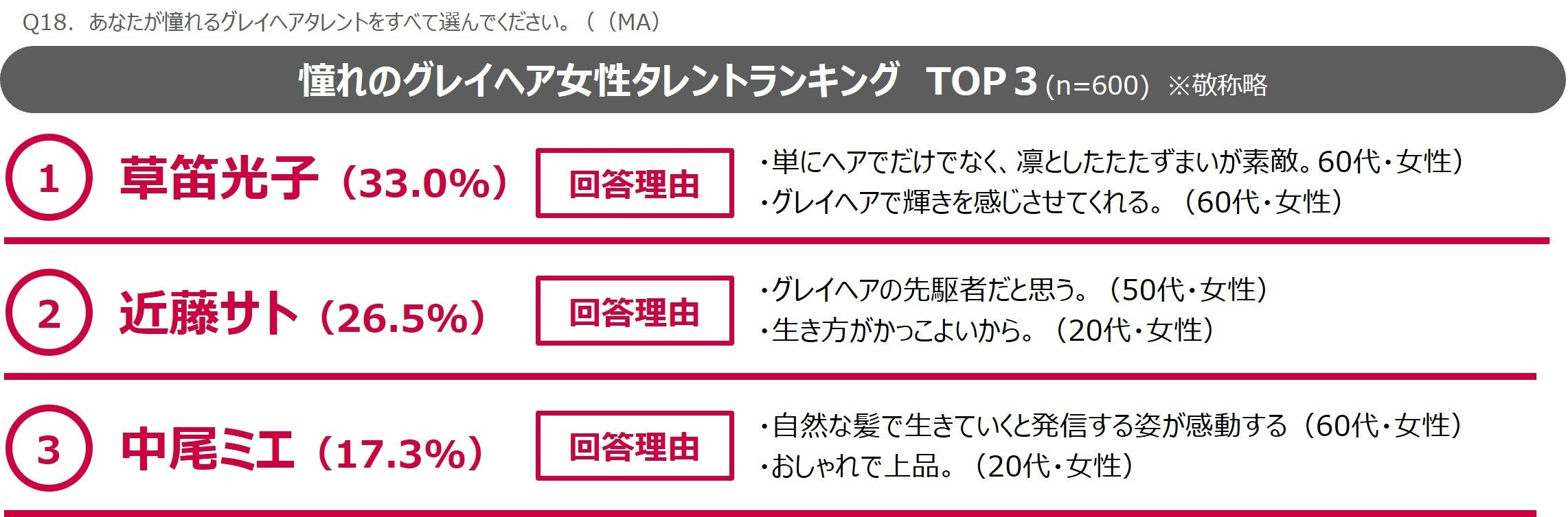 最後に、各世代が憧れる「グレイヘア女性タレント」のランキングを発表。第1位は、女優として活躍する「草笛光子さん(33.0%)」となりました(Q19)。回答者からは、「単にヘアでだけで憧れているのではなく、凛としたたたずまいが素敵。(60代・女性)」、「グレイヘアで輝きを感じさせてくれる(60代・女性)」などの理由が挙げられ、草笛さんの生き生きと自分らしく生きている姿に憧れを持つ女性が多いことが分かりました。次いで、第2位はグレイヘアのパイオニアとも言われる「近藤サトさん(26.5%)」、第3位は歌手・女優の「中尾ミエさん(17.3%)」が続く結果となりました。