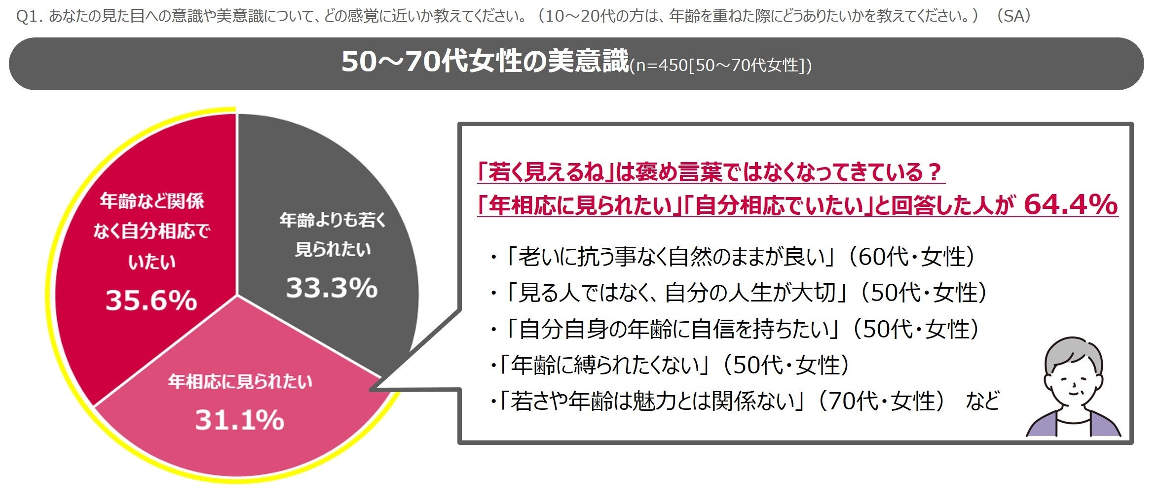 ✔見た目への美意識:50代~70代女性、約7割近くが「見た目よりも若く見られたい」よりも「年相応で見られたい」「年齢など関係なく自分相応でいたい」と回答