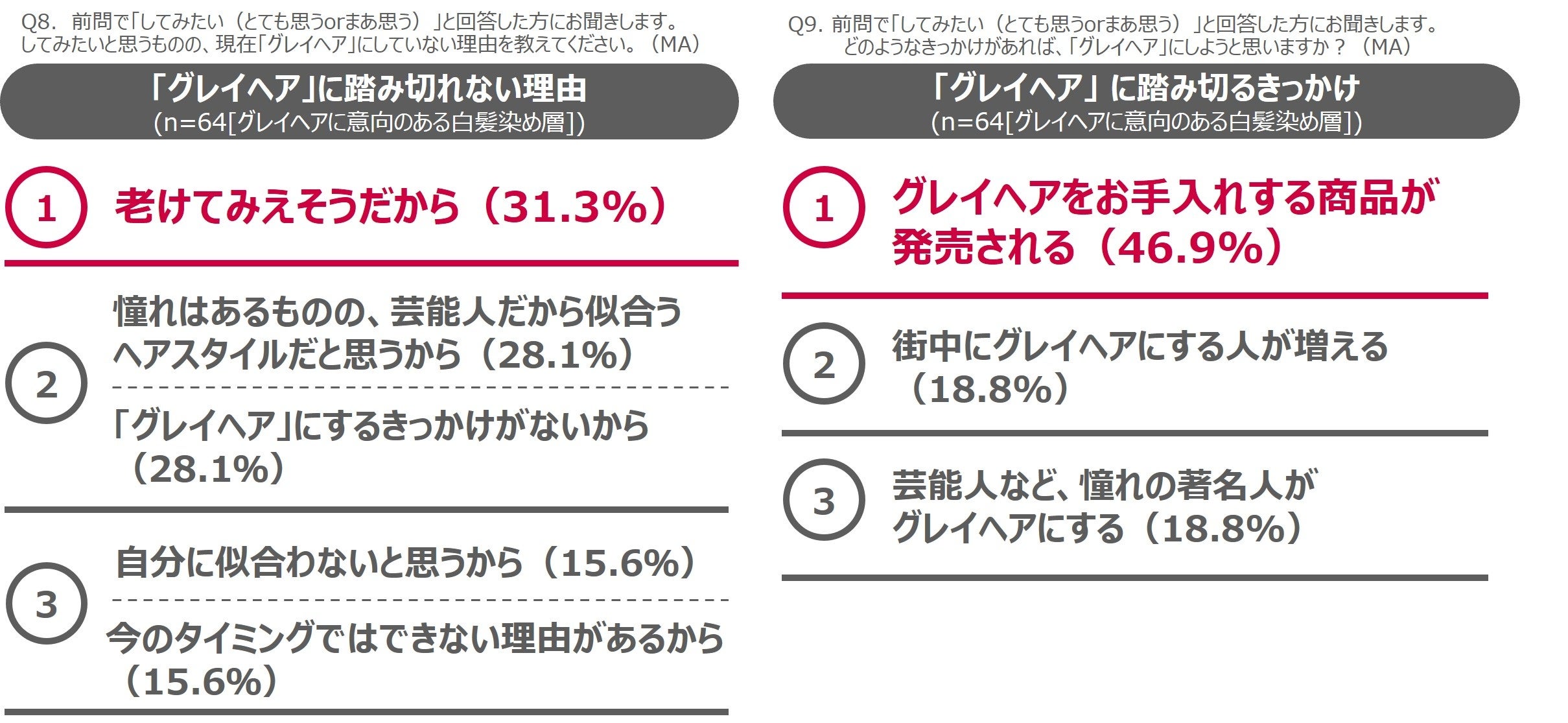 一方で、「グレイヘア」への移行期に「伸びかけ白髪への対処法が分からなかった」という理由から挫折をしてしまう人や、「グレイヘア」への憧れはあるものの、「老けてしまうのではないか」「タレントやモデルだから似合うケアスタイルなのではないか」という不安から、「グレイヘア」に踏み出すこと自体にハードルを感じている人が多いことも分かりました。