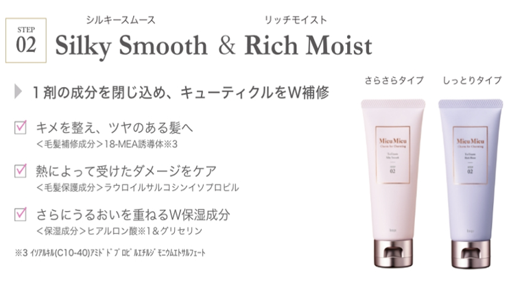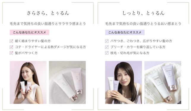 さらに、仕上がりの質感は「さらさらタイプ」と「しっとりタイプ」の2種類あり、髪質や髪のお悩みに合わせて選べます。