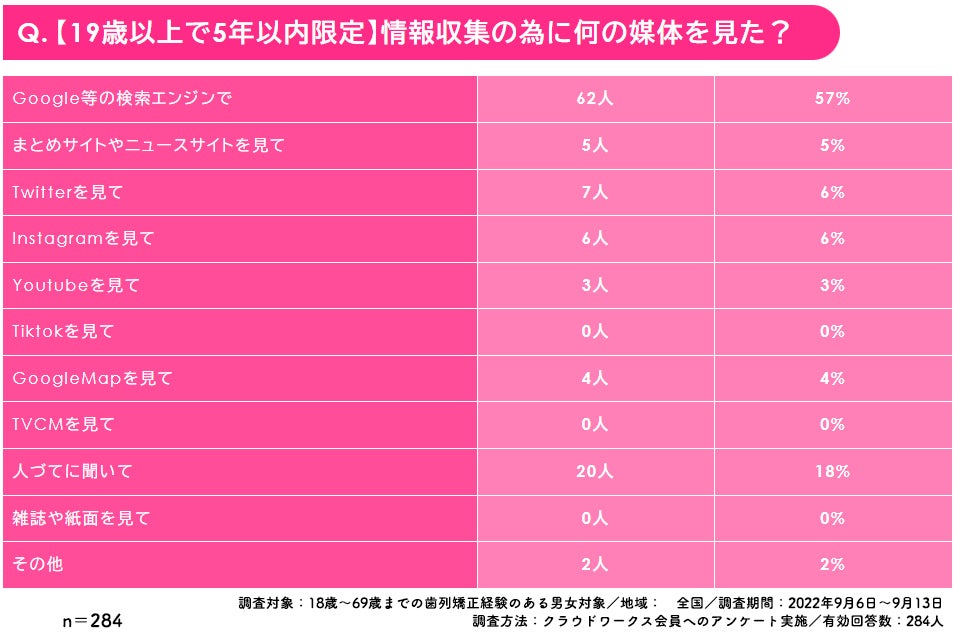 - 調査結果5 成人矯正の57%はGoogle検索で情報調査。SNSは少なめ。