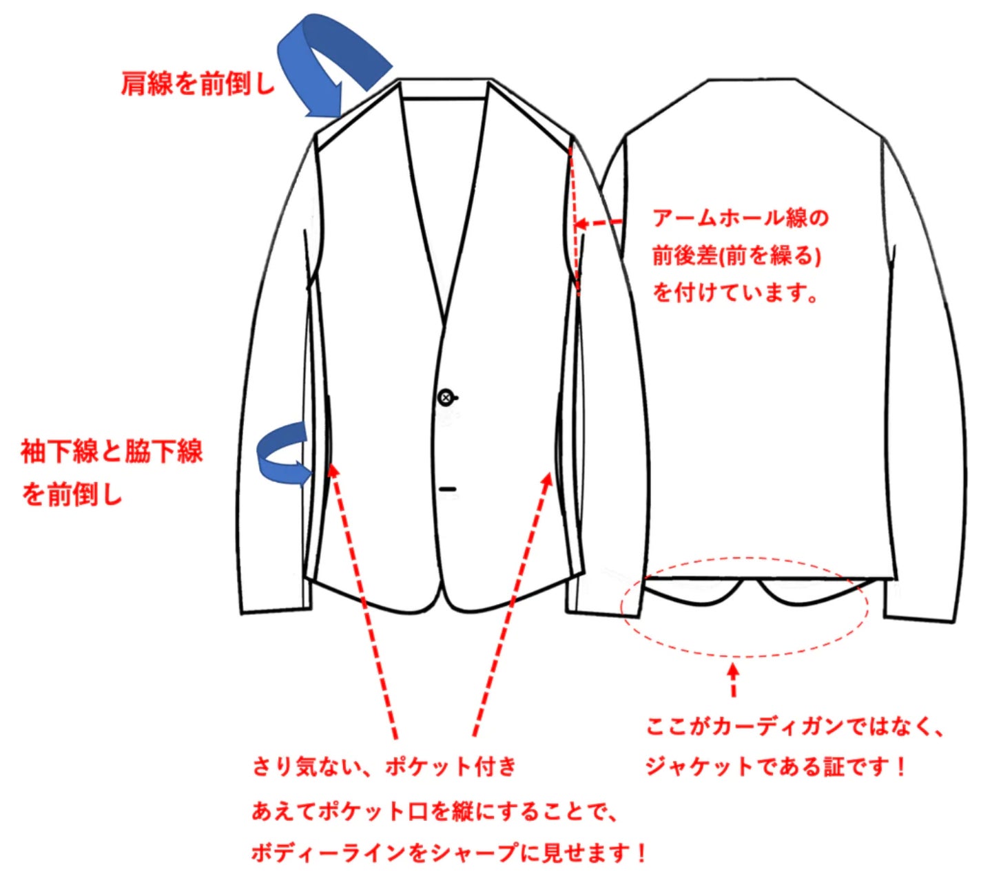 これにより、前かがみの姿勢になりがちな筋肉量の多いマッチョの皆様にも自然体でストレスなく着ていただけます!