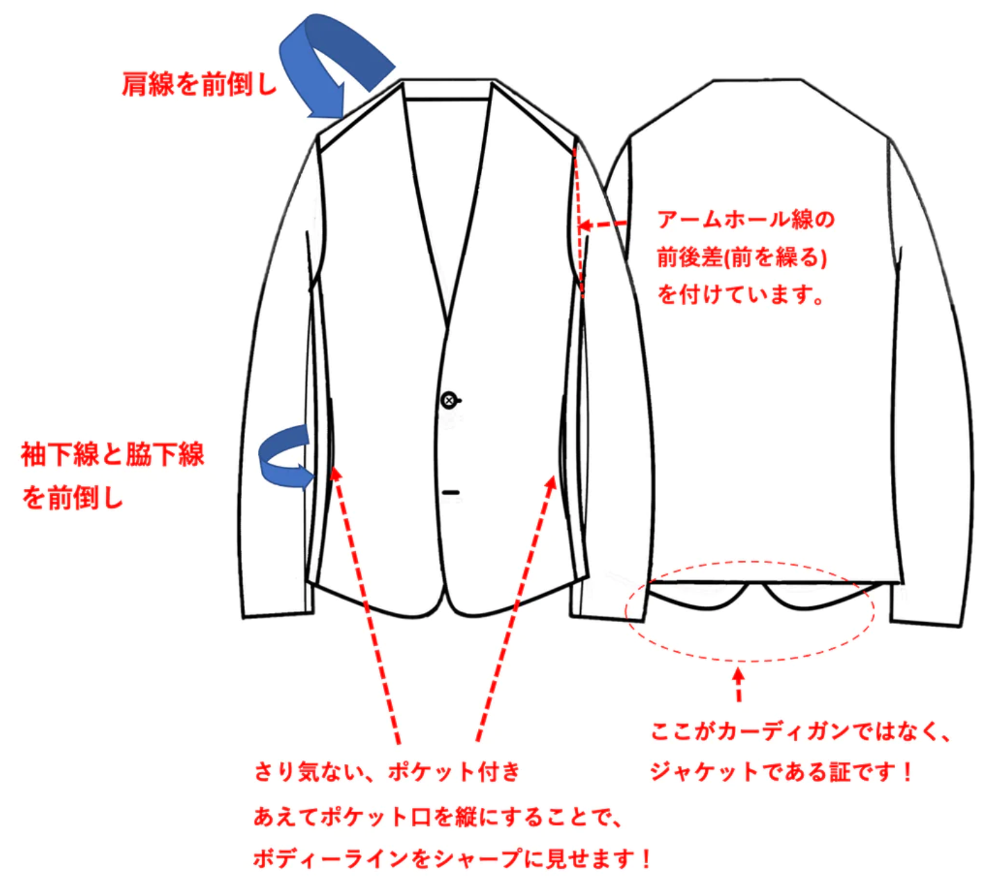 これにより、前かがみの姿勢になりがちな筋肉量の多いマッチョの皆様にも自然体でストレスなく着ていただけます!