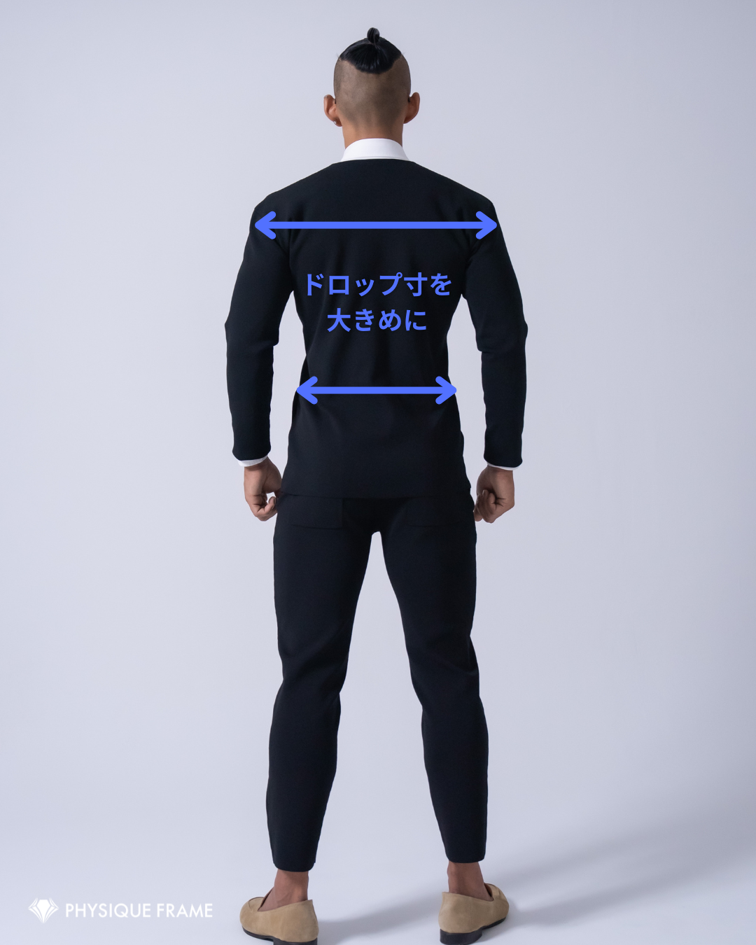 ●ドロップ寸を大きめにつけ、逆三角形の身体を美しく見せる!