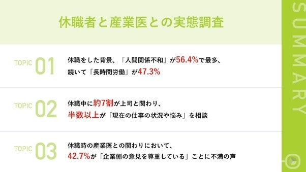 今回は、メンタル不調を原因に休職した経験がある会社員110名を対象に、休職者と産業医との実態調査を実施しました。