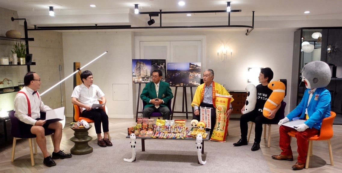 出演者の前に置かれているテーブルには、各社の代表商品などが陳列されていました。撮影前には、チンアナゴのぬいぐるみがうまく固定できず、苦労した場面も。ぜひ、テーブルの上にも注目してご覧ください。