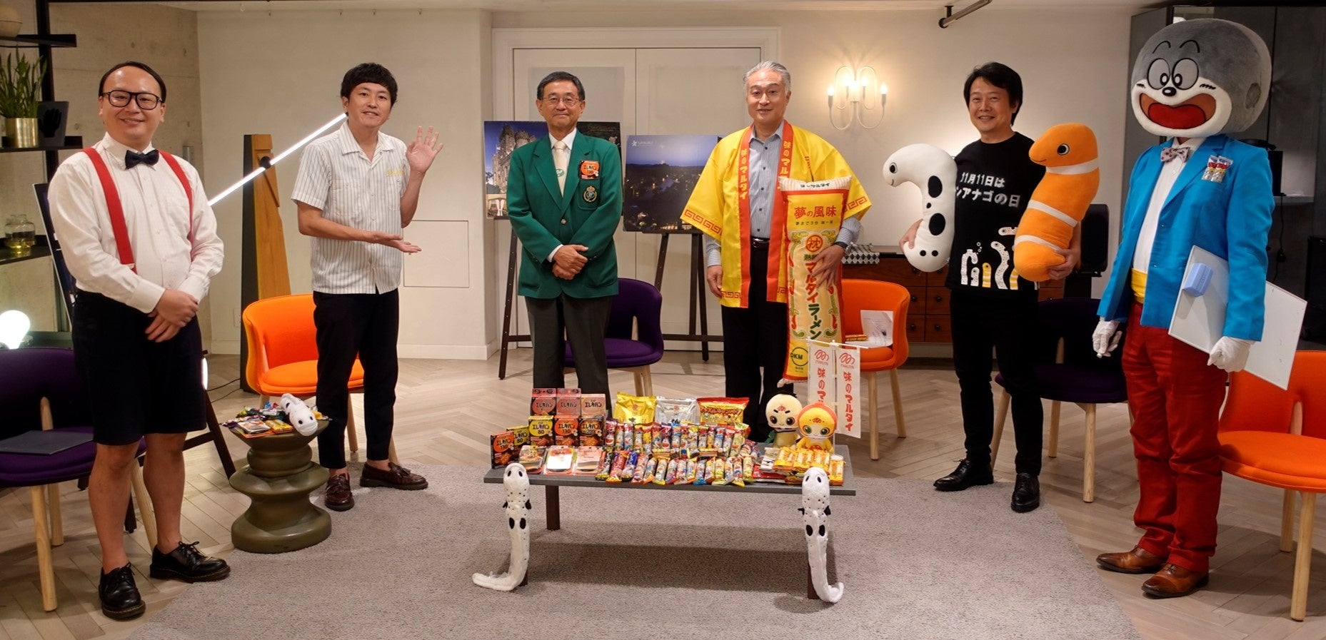 今年はすみだ水族館「チンアナゴの日」も仲間に加わり、ピップ社長の松浦、マルタイの川島社長、すみだ水族館の毛塚館長、やおきんからは遠い宇宙からやってきた異星人うまえもんという異業種企業の4名が、しずる村上さん&トレンディエンジェルたかしさんという異色コンビと対談を行いました。対談では、司会を務めた芸人のお二人に各社の記念日を広めるためのギャグや、Twitterキャンペーンで使用するハッシュタグを考案いただくなど、見どころたっぷりの内容になっています。