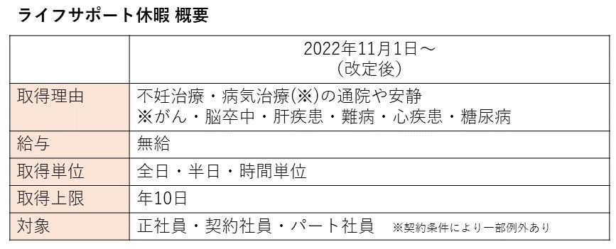 そこで、病気を抱えていても両立しながら就業出来る環境を整えるため、 不妊治療に対応した既存のライフサポート休暇を特定の病気治療の通院や安静にも使用できるよう拡充いたしました。
