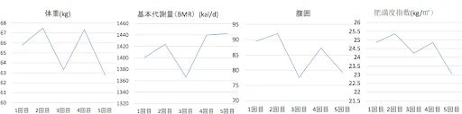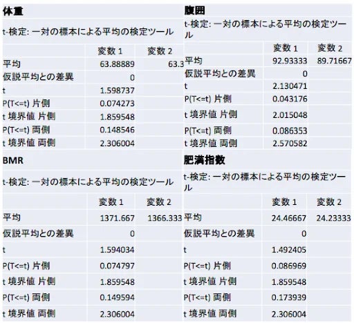 それぞれP値は有意水準である0・05より大きな値であると言えるため、体重、腹囲、BMR、肥満度指数について有意差がないと言えます。