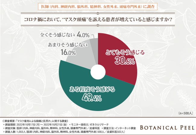 そこで今回、『BOTANICAL PEEL』(https://www.botanical-peel.com/)を展開する株式会社CREDEAは、医師(内科、神経内科、脳外科、精神科、女性外来、頭痛専門外来)/皮膚科医を対象に、「マスク着用による頭痛と肌荒れ」に関する調査を実施しました。