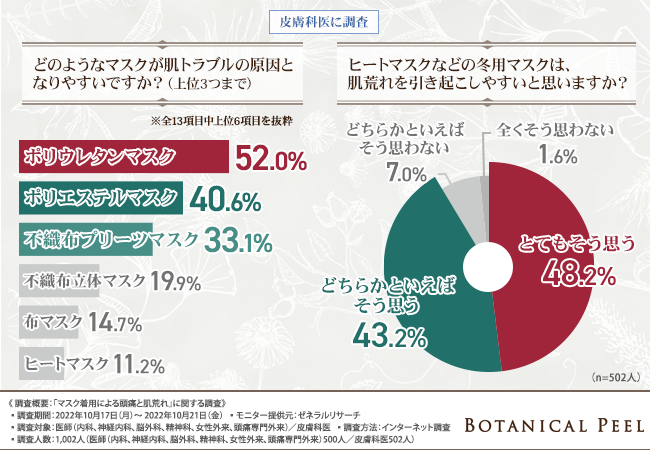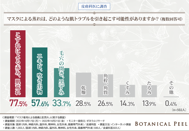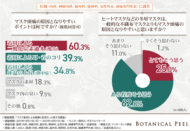 そこで今回、『BOTANICAL PEEL』(https://www.botanical-peel.com/)を展開する株式会社CREDEAは、医師(内科、神経内科、脳外科、精神科、女性外来、頭痛専門外来)/皮膚科医を対象に、「マスク着用による頭痛と肌荒れ」に関する調査を実施しました。