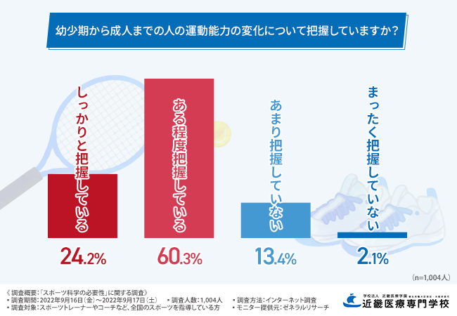 「幼少期から成人までの人の運動能力の変化について把握していますか?」と質問したところ、『しっかりと把握している(24.2%)』『ある程度把握している(60.3%)』『あまり把握していない(13.4%)』『まったく把握していない(2.1%)』という回答結果になりました。