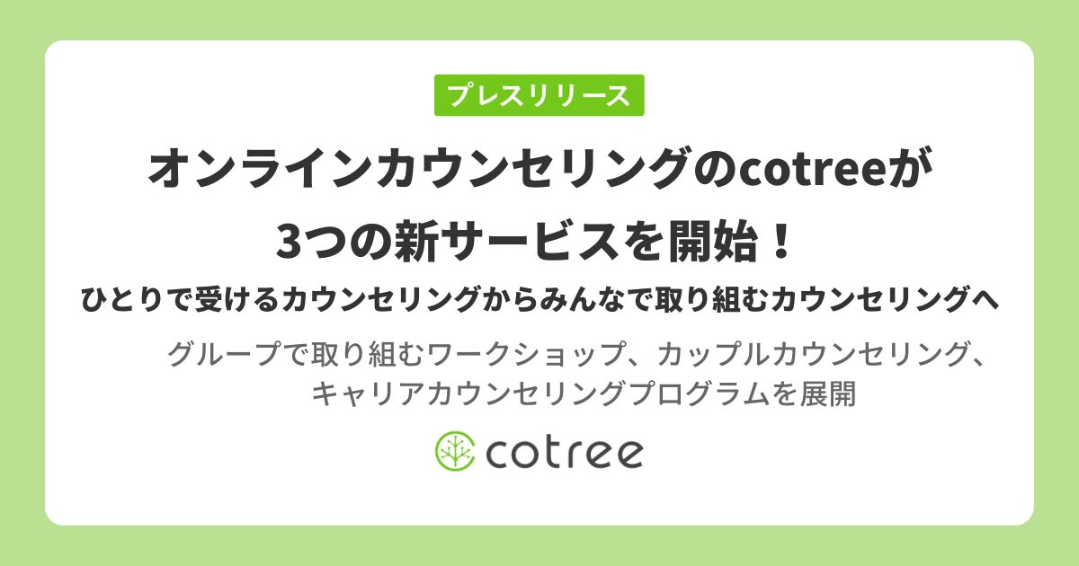 オンラインカウンセリング・コーチングの「cotree」を展開する株式会社cotree(本社:東京都港区、代表取締役:西岡 恵子、以下cotree)は、2022年11月より「グループワークショップ」や「カップルカウンセリング」「キャリアカウンセリングプログラム」の3つの新サービスを開始することをお知らせいたします。