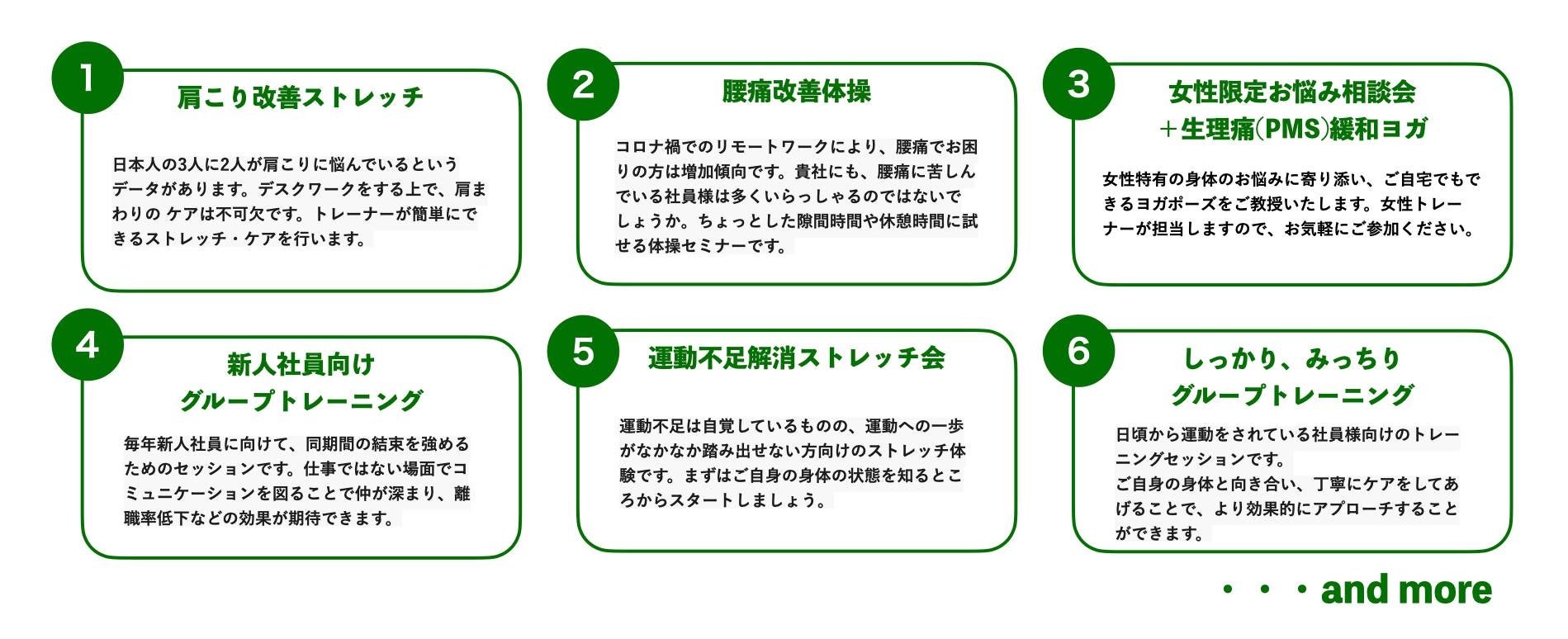 ・お身体お悩み相談:腰痛、肩こり、姿勢崩れなどに対し、お仕事中に意識してほしい姿勢や簡易ストレッチなどを指導