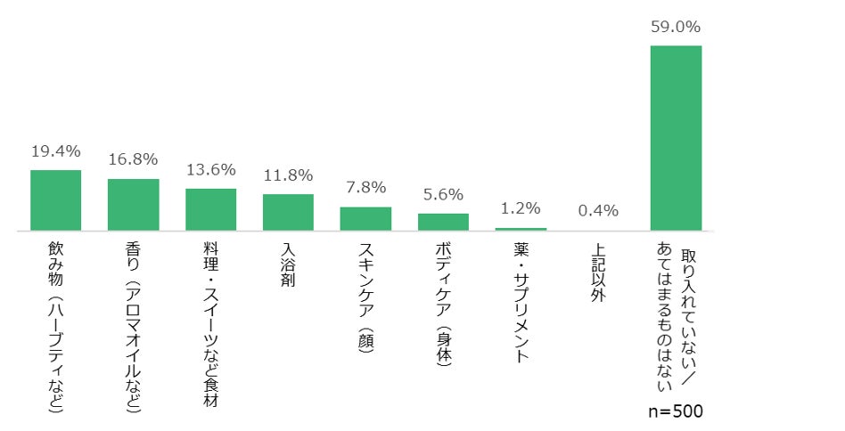 取り入れ方としては飲み物やアロマオイルなど香りを楽しめるアイテムとして取り入れている人が多く、「スキンケア」や「ボディケア」など美容として取り入れている人は1割以下にとどまりました。