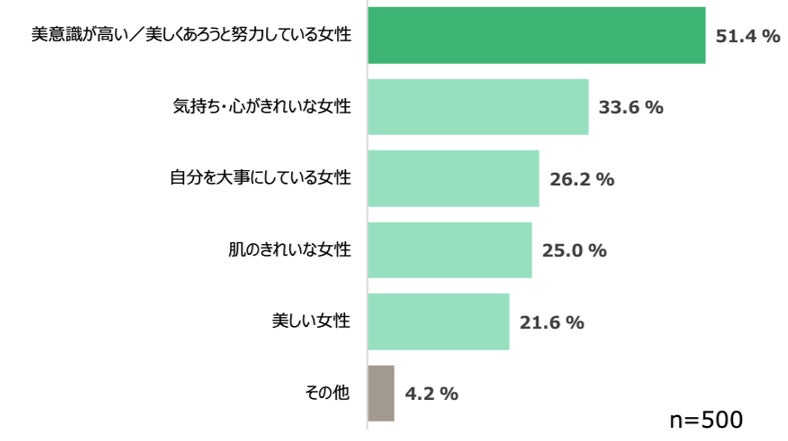 『「ハーブ」を生活に上手に取り入れている女性と聞いて、あなたはどのような女性をイメージしますか。』と質問したところ、「美意識が高い/美しくあろうと努力している女性(51.4%)」が最多となりました。続いて、「気持ち・心がきれいな女性(33.6%)」「自分を大事にしている女性(26.2%)」と、ハーブを日々の生活に取り入れている女性に対して、心身への意識の高い美しい女性をイメージする人が多いことがみてとれます。