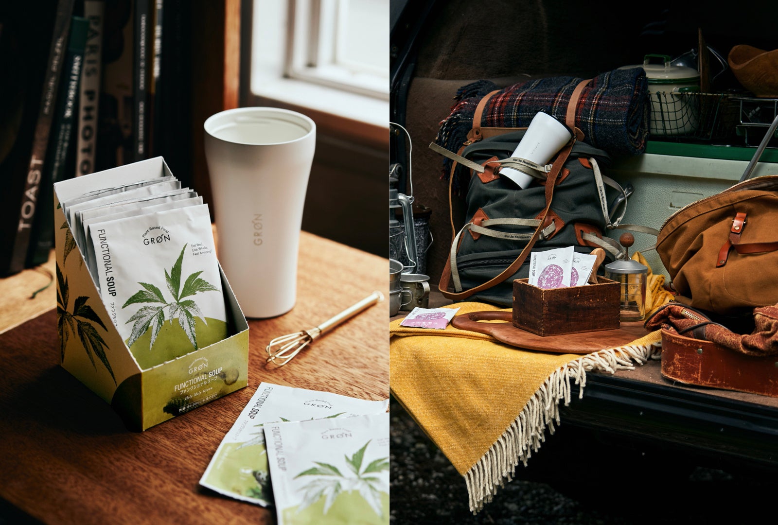 展示会初日の14日には、ファンクショナルスープのレシピ開発を担当した「Maruta」石松シェフを招き、表参道・鎌倉・京都に直営店を構える、アウトドアライフスタイル企業・株式会社アンプラージュインターナショナル(UPI)のクッキングウェアを使ったガストロノミー料理に合わせ、今回の新製品を提供。開催期間中には、GRØNの製品もセットになった女性の悩みを解決する定期便「Balanced Box」プロデュースのヨガのワークショップなど、コンテンツが盛り沢山です。