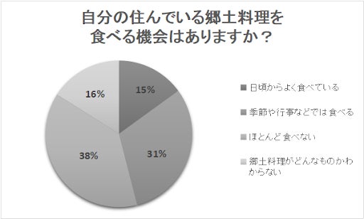 そこで、「自分の住んでいる郷土料理を食べる機会はありますか?」というアンケートを行いました。すると、「日頃からよく食べている」と答えたのは15%の人にとどまりました。