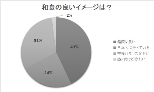 一番多かったのは、「健康に良い」で43%、次が「栄養バランスが良い」で31%でした。また、「日本人に会っている」も24%と一定数いました。