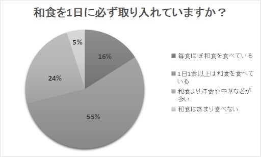 ただ、「和食より洋食や中華などが多い」と答えた人が24%、「和食はあまり食べない」と答えた人も5%と和食から少し離れた食生活を送っている人も一定数いることがわかりました。