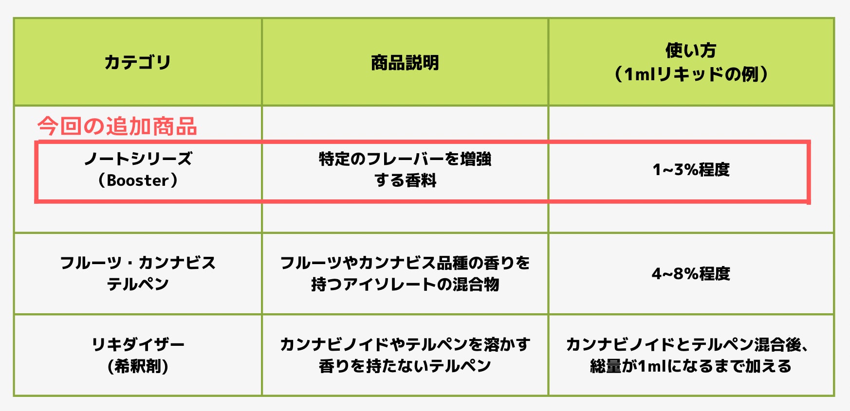 CBD直販サイト「tokyo mooon」では多様化するニーズにお答えし、これまで取り扱っていたテルペンに加えて新たに5種類の香料(別称「ノートシリーズ(Booster)」)のラインナップを追加しました。